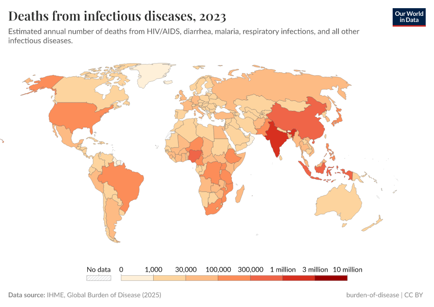 IHME, Global Burden of Disease (2024) – with minor processing by Our World in Data. “Deaths from infectious diseases” [dataset]. IHME, Global Burden of Disease, “Global Burden of Disease - Deaths and DALYs” [original data]. Retrieved June 26, 2025 from https://remove-datapage-tags.owid.pages.dev/grapher/deaths-from-infectious-diseases