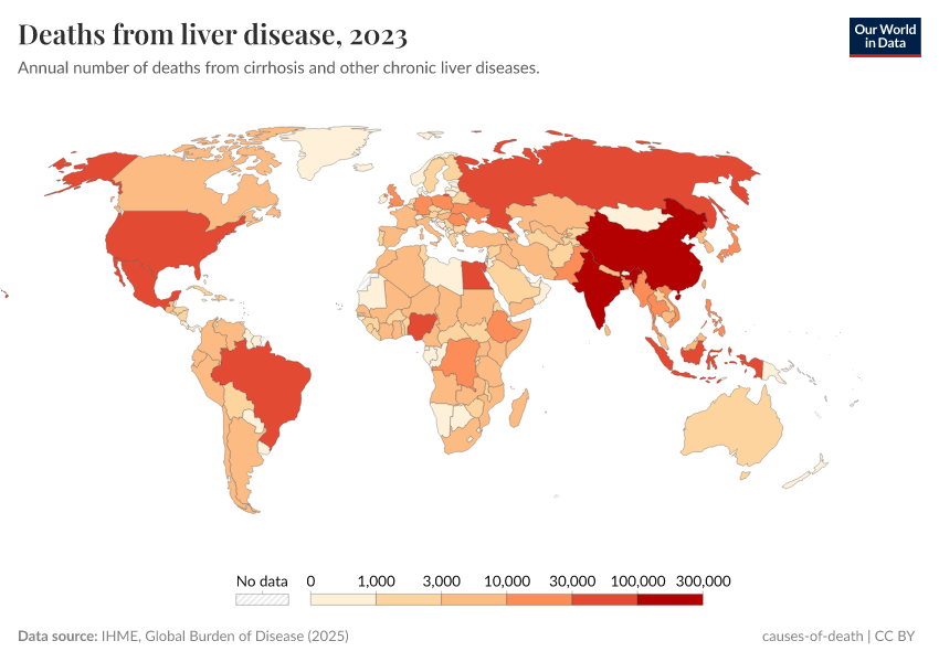 IHME, Global Burden of Disease (2024) – with minor processing by Our World in Data. “Deaths from liver disease” [dataset]. IHME, Global Burden of Disease, “Global Burden of Disease - Deaths and DALYs” [original data]. Retrieved June 26, 2025 from https://remove-datapage-tags.owid.pages.dev/grapher/deaths-from-liver-disease
