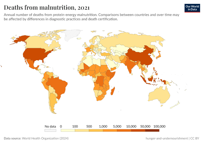 World Health Organization (2024) – with major processing by Our World in Data. “Deaths from malnutrition” [dataset]. World Health Organization, “Global Health Estimates” [original data]. Retrieved June 26, 2025 from https://remove-datapage-tags.owid.pages.dev/grapher/deaths-from-malnutrition-ghe