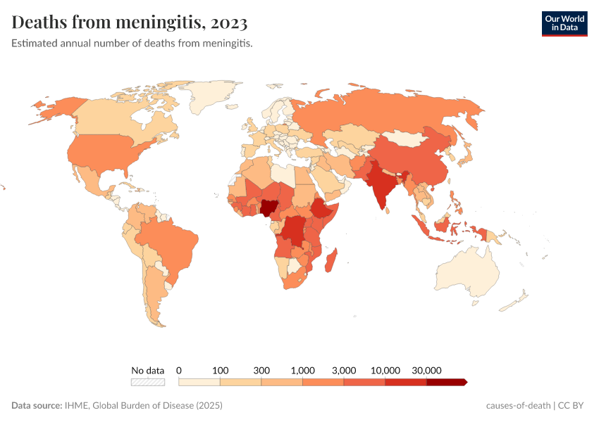 “Data Page: Deaths from meningitis”, part of the following publication: Esteban Ortiz-Ospina and Max Roser (2016) - “Global Health”. Data adapted from IHME, Global Burden of Disease. Retrieved from https://remove-datapage-tags.owid.pages.dev/grapher/deaths-from-meningitis [online resource]How to cite this data
