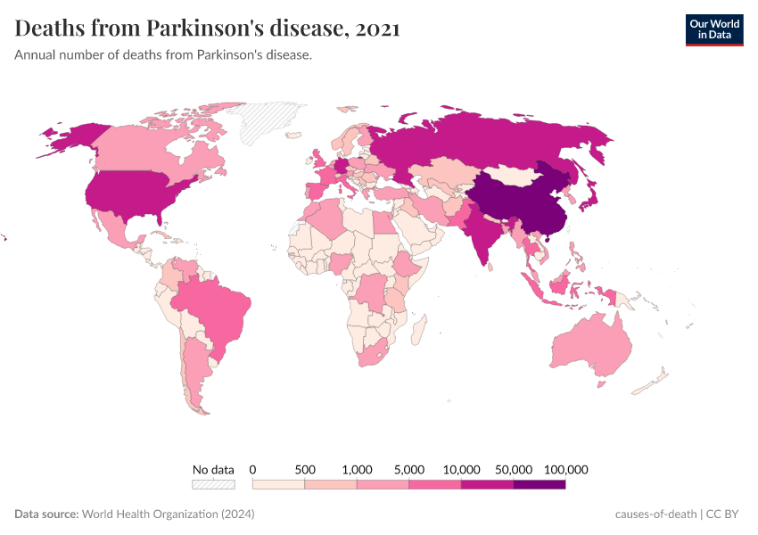World Health Organization (2024) – with major processing by Our World in Data. “Deaths from Parkinson's disease” [dataset]. World Health Organization, “Global Health Estimates” [original data]. Retrieved June 26, 2025 from https://remove-datapage-tags.owid.pages.dev/grapher/deaths-from-parkinsons-disease-ghe