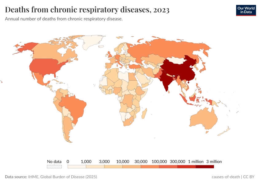 IHME, Global Burden of Disease (2024) – with minor processing by Our World in Data. “Deaths from chronic respiratory diseases” [dataset]. IHME, Global Burden of Disease, “Global Burden of Disease - Deaths and DALYs” [original data]. Retrieved June 26, 2025 from https://remove-datapage-tags.owid.pages.dev/grapher/deaths-from-respiratory-disease