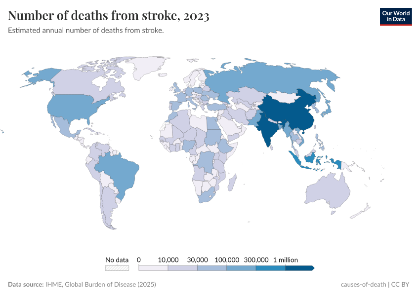 IHME, Global Burden of Disease (2024) – with minor processing by Our World in Data. “Number of deaths from stroke” [dataset]. IHME, Global Burden of Disease, “Global Burden of Disease - Deaths and DALYs” [original data]. Retrieved June 26, 2025 from https://remove-datapage-tags.owid.pages.dev/grapher/deaths-from-strokes