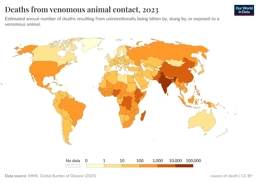 IHME, Global Burden of Disease (2024) – with minor processing by Our World in Data. “Deaths from venomous animal contact” [dataset]. IHME, Global Burden of Disease, “Global Burden of Disease - Deaths and DALYs” [original data]. Retrieved June 26, 2025 from https://remove-datapage-tags.owid.pages.dev/grapher/deaths-from-venomous-animal-contact