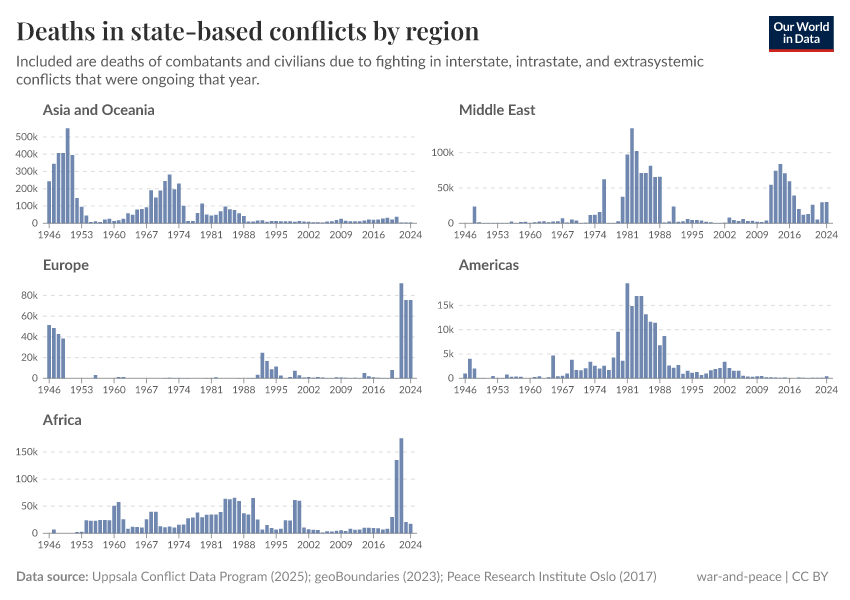 Uppsala Conflict Data Program (2025); Natural Earth (2022); Peace Research Institute Oslo (2017) – processed by Our World in Data. “Deaths in state-based conflicts by region” [dataset]. Uppsala Conflict Data Program, “Georeferenced Event Dataset v25.1”; Natural Earth, “Natural Earth - Large scale data (1:10m Cultural Vectors) 5.1.1”; Peace Research Institute Oslo, “Battle deaths v3.1” [original data]. Retrieved June 26, 2025 from https://remove-datapage-tags.owid.pages.dev/grapher/deaths-in-state-based-conflicts-by-region