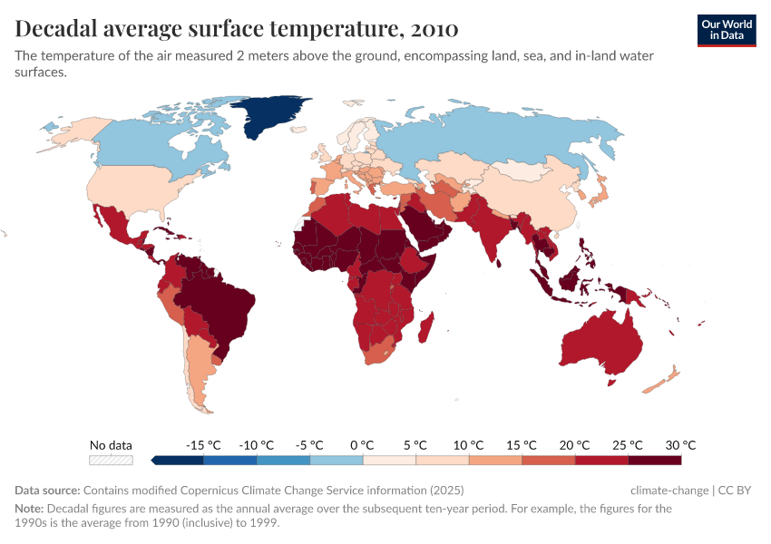 “Data Page: Decadal average surface temperature”, part of the following publication: Hannah Ritchie, Pablo Rosado, and Veronika Samborska (2024) - “Climate Change”. Data adapted from Contains modified Copernicus Climate Change Service information. Retrieved from https://remove-datapage-tags.owid.pages.dev/grapher/decadal-average-surface-temperature [online resource]How to cite this data