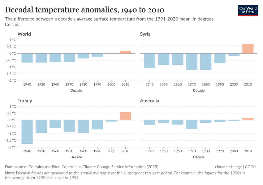 Contains modified Copernicus Climate Change Service information (2025) – with major processing by Our World in Data. “Decadal temperature anomalies” [dataset]. Contains modified Copernicus Climate Change Service information, “ERA5 monthly averaged data on single levels from 1940 to present 2” [original data]. Retrieved June 26, 2025 from https://remove-datapage-tags.owid.pages.dev/grapher/decadal-temperature-anomaly