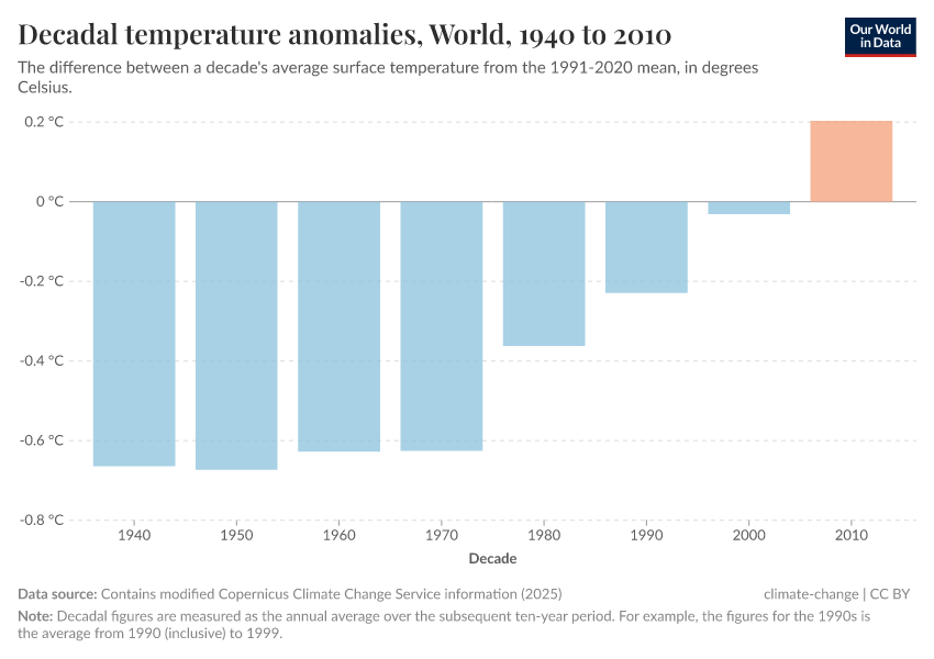 Contains modified Copernicus Climate Change Service information (2025) – with major processing by Our World in Data. “Decadal temperature anomalies” [dataset]. Contains modified Copernicus Climate Change Service information, “ERA5 monthly averaged data on single levels from 1940 to present 2” [original data]. Retrieved June 26, 2025 from https://remove-datapage-tags.owid.pages.dev/grapher/decadal-temperature-anomaly
