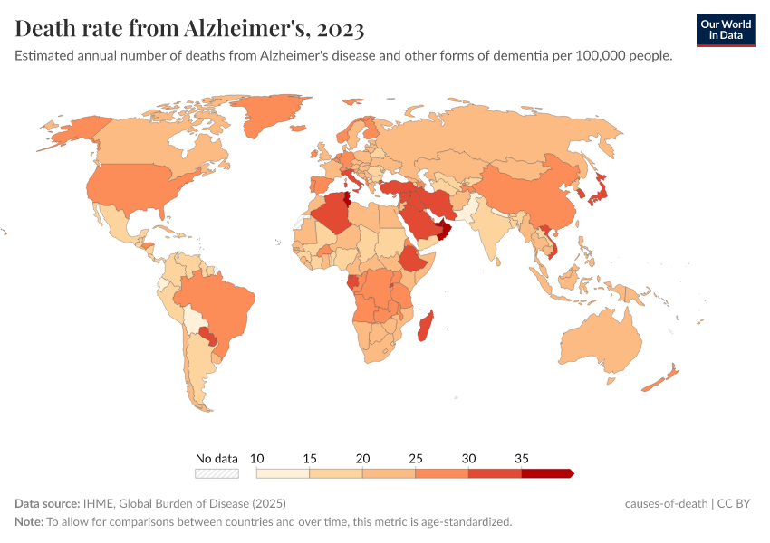 IHME, Global Burden of Disease (2024) – with minor processing by Our World in Data. “Death rate from Alzheimer's” [dataset]. IHME, Global Burden of Disease, “Global Burden of Disease - Deaths and DALYs” [original data]. Retrieved June 26, 2025 from https://remove-datapage-tags.owid.pages.dev/grapher/dementia-death-rates