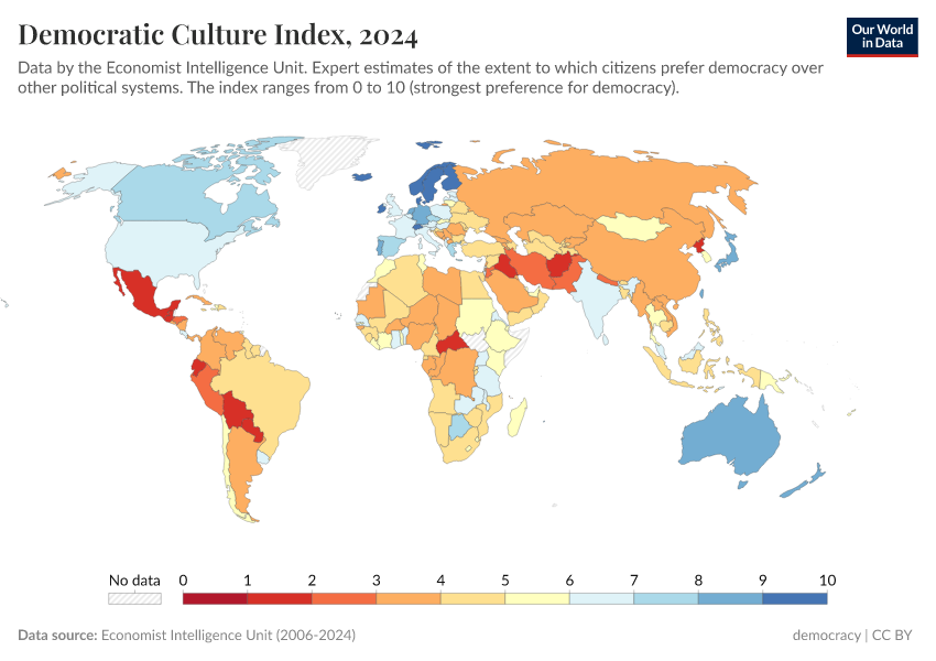 Economist Intelligence Unit (2006-2024) – processed by Our World in Data. “Democratic culture index” [dataset]. Economist Intelligence Unit, “Democracy Index 2021: The China challenge”; Economist Intelligence Unit, “Democracy Index 2022: Frontline democracy and the battle for Ukraine”; Economist Intelligence Unit, “Democracy Index 2023: Age of Conflict”; Economist Intelligence Unit, “Democracy Index 2024: What's wrong with representative democracy?”; Gapminder, “Democracy Index v4”; Various sources, “Population” [original data]. Retrieved June 26, 2025 from https://remove-datapage-tags.owid.pages.dev/grapher/democratic-culture-index-eiu