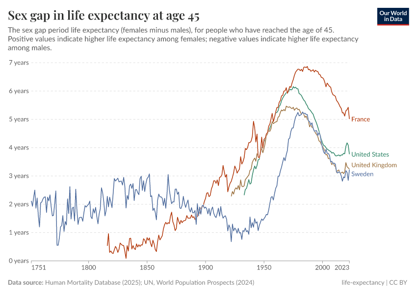Human Mortality Database (2024); UN, World Population Prospects (2024) – with major processing by Our World in Data. “Life expectancy at 45 – HMD – female-male difference, period tables” [dataset]. Human Mortality Database, “Human Mortality Database”; United Nations, “World Population Prospects” [original data]. Retrieved June 26, 2025 from https://remove-datapage-tags.owid.pages.dev/grapher/difference-in-female-and-male-life-expectancy-at-age-45