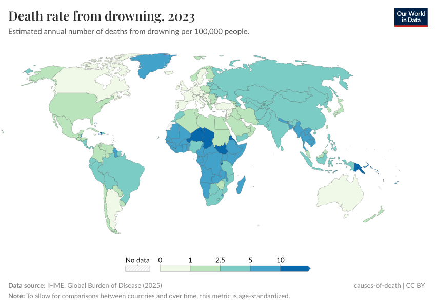 IHME, Global Burden of Disease (2024) – with minor processing by Our World in Data. “Death rate from drowning” [dataset]. IHME, Global Burden of Disease, “Global Burden of Disease - Deaths and DALYs” [original data]. Retrieved June 26, 2025 from https://remove-datapage-tags.owid.pages.dev/grapher/drowning-death-rates