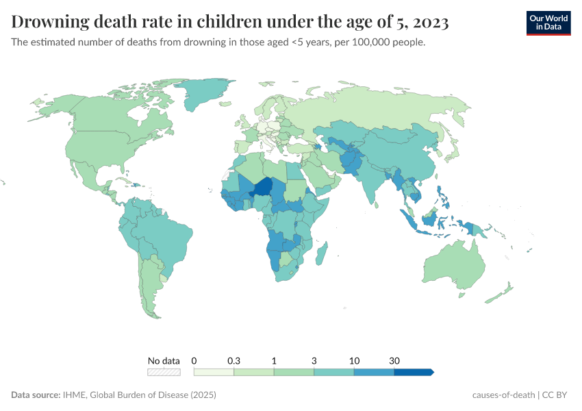 IHME, Global Burden of Disease (2024) – with minor processing by Our World in Data. “Drowning death rate in children under the age of 5” [dataset]. IHME, Global Burden of Disease, “Global Burden of Disease - Deaths and DALYs” [original data]. Retrieved June 26, 2025 from https://remove-datapage-tags.owid.pages.dev/grapher/drowning-death-rates-under-5