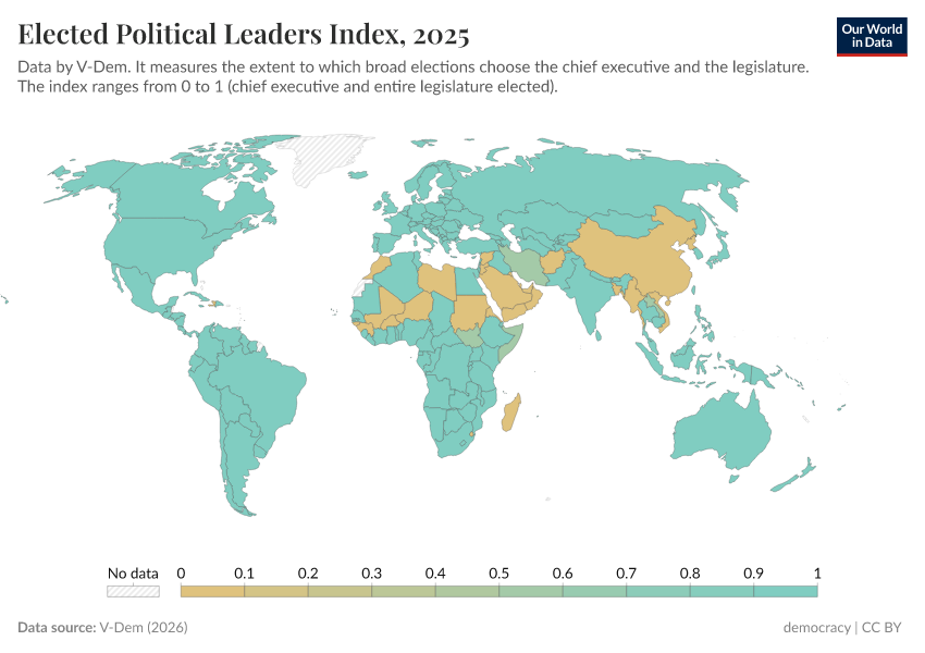 V-Dem (2025) – processed by Our World in Data. “Elected officials index” [dataset]. V-Dem, “Democracy report v15” [original data]. Retrieved June 26, 2025 from https://remove-datapage-tags.owid.pages.dev/grapher/elected-political-leaders-index