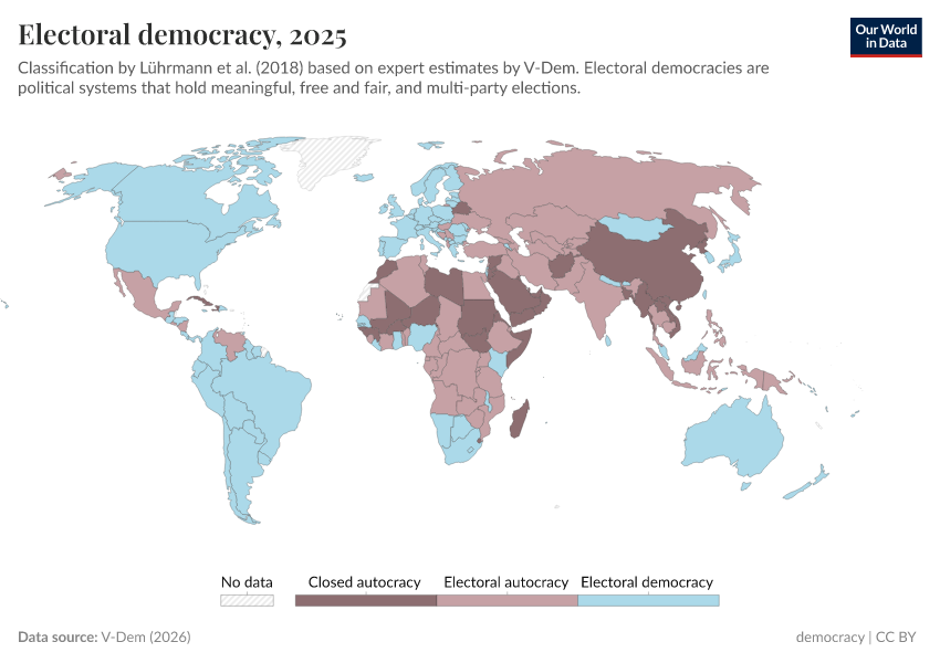 V-Dem (2025) – processed by Our World in Data. “Political regime – reduced” [dataset]. V-Dem, “Democracy report v15” [original data]. Retrieved June 26, 2025 from https://remove-datapage-tags.owid.pages.dev/grapher/electoral-democracy-row