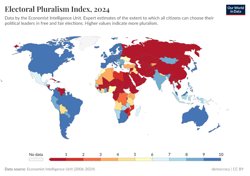 Economist Intelligence Unit (2006-2024) – processed by Our World in Data. “Electoral pluralism index” [dataset]. Economist Intelligence Unit, “Democracy Index 2021: The China challenge”; Economist Intelligence Unit, “Democracy Index 2022: Frontline democracy and the battle for Ukraine”; Economist Intelligence Unit, “Democracy Index 2023: Age of Conflict”; Economist Intelligence Unit, “Democracy Index 2024: What's wrong with representative democracy?”; Gapminder, “Democracy Index v4”; Various sources, “Population” [original data]. Retrieved June 26, 2025 from https://remove-datapage-tags.owid.pages.dev/grapher/electoral-pluralism-index-eiu