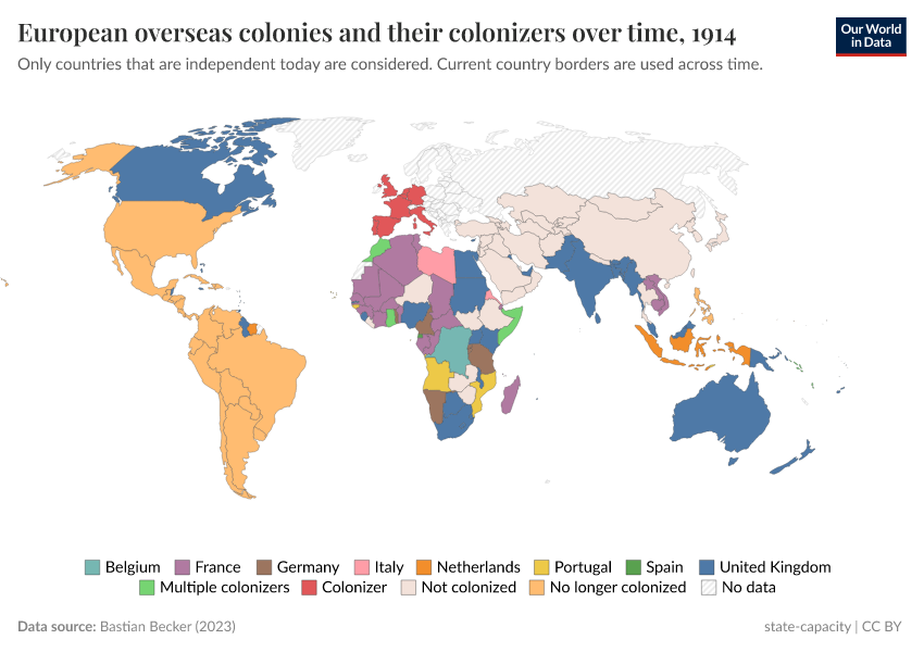 “Data Page: European overseas colonies and their colonizers over time”, part of the following publication: Bastian Herre and Pablo Arriagada (2023) - “State Capacity”. Data adapted from Bastian Becker. Retrieved from https://remove-datapage-tags.owid.pages.dev/grapher/european-overseas-colonies-and-their-colonizers [online resource]How to cite this data