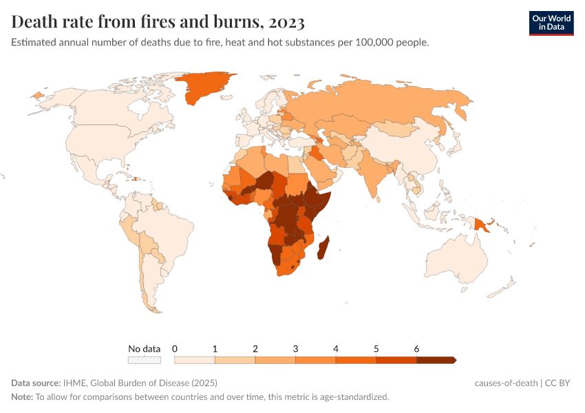 IHME, Global Burden of Disease (2024) – with minor processing by Our World in Data. “Death rate from fires and burns” [dataset]. IHME, Global Burden of Disease, “Global Burden of Disease - Deaths and DALYs” [original data]. Retrieved June 26, 2025 from https://remove-datapage-tags.owid.pages.dev/grapher/fire-death-rates