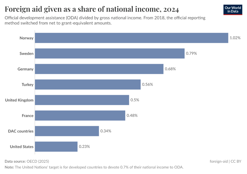 “Data Page: Foreign aid given as a share of national income”, part of the following publication: Bastian Herre, Pablo Arriagada, Simon van Teutem, and Hannah Ritchie (2024) - “Foreign Aid”. Data adapted from OECD. Retrieved from https://remove-datapage-tags.owid.pages.dev/grapher/foreign-aid-given-as-a-share-of-national-income [online resource]How to cite this data