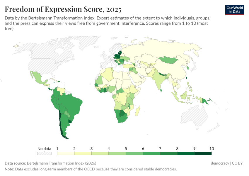 “Data Page: Freedom of expression score”, part of the following publication: Bastian Herre, Lucas Rodés-Guirao, and Esteban Ortiz-Ospina (2013) - “Democracy”. Data adapted from Bertelsmann Transformation Index. Retrieved from https://remove-datapage-tags.owid.pages.dev/grapher/freedom-of-expression-score-bti [online resource]How to cite this data