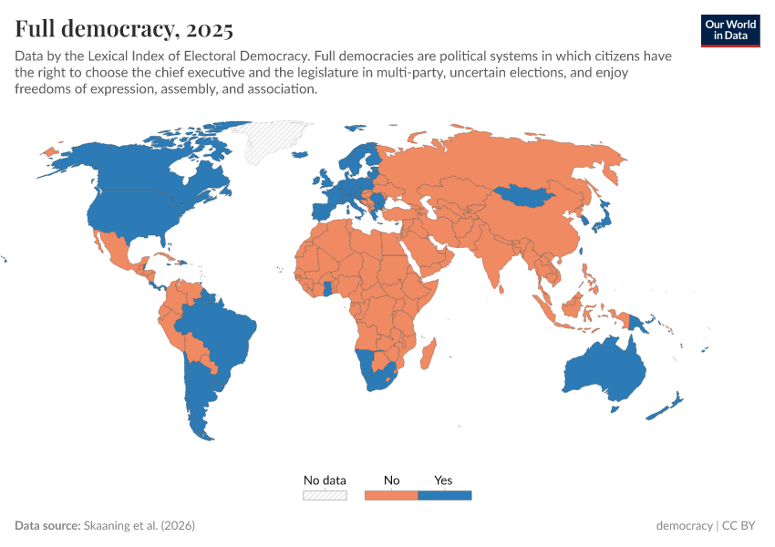 Skaaning et al. (2024) – processed by Our World in Data. “Full democracy” [dataset]. Skaaning et al., “Lexical Index of Electoral Democracy (LIED) v6.6” [original data]. Retrieved June 26, 2025 from https://remove-datapage-tags.owid.pages.dev/grapher/full-democracy-lexical
