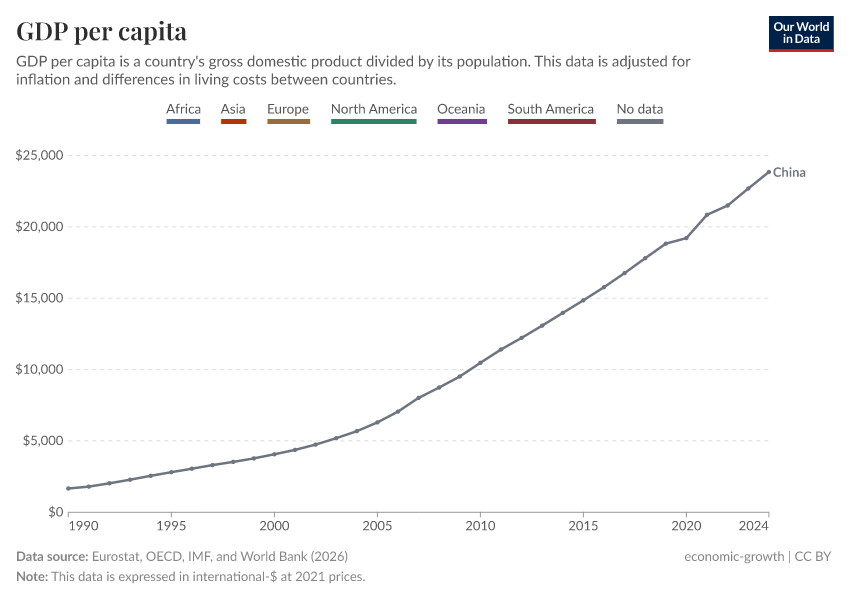 Eurostat, OECD, and World Bank (2025) – with minor processing by Our World in Data. “GDP per capita – World Bank – In constant international-$” [dataset]. Eurostat, OECD, and World Bank, “World Development Indicators” [original data]. Retrieved June 26, 2025 from https://remove-datapage-tags.owid.pages.dev/grapher/gdp-per-capita-worldbank
