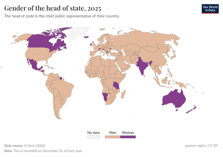 V-Dem (2025) – processed by Our World in Data. “Gender of the head of state” [dataset]. V-Dem, “Democracy report v15” [original data]. Retrieved June 26, 2025 from https://remove-datapage-tags.owid.pages.dev/grapher/gender-of-the-head-of-state