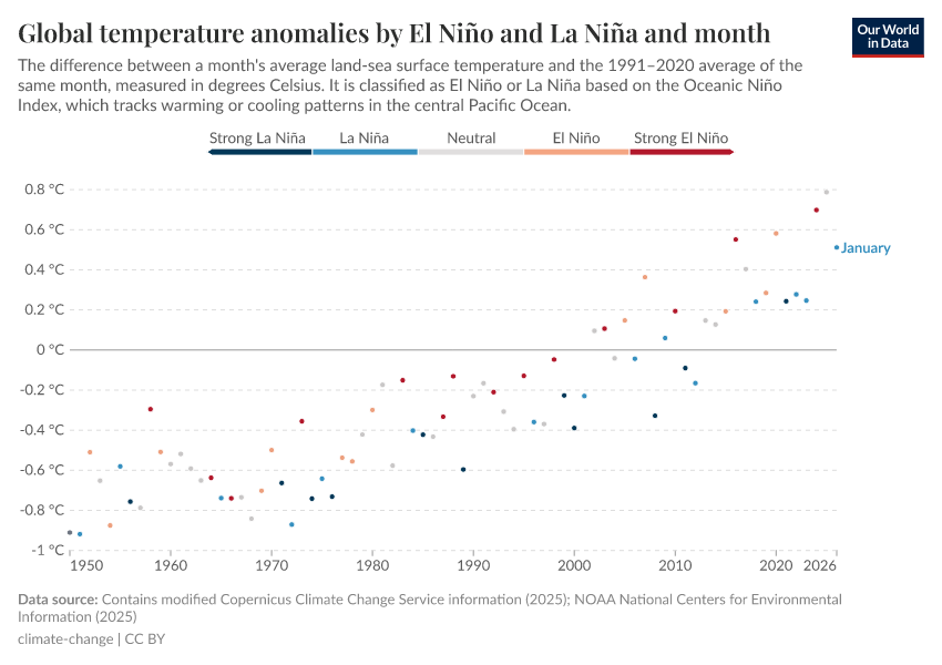 “Data Page: Global temperature anomalies by El Niño and La Niña and month”, part of the following publication: Hannah Ritchie, Pablo Rosado, and Veronika Samborska (2024) - “Climate Change”. Data adapted from Contains modified Copernicus Climate Change Service information. Retrieved from https://remove-datapage-tags.owid.pages.dev/grapher/global-temperature-anomalies-by-el-nino-la-nina-and-month [online resource]