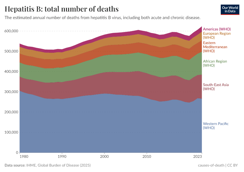 IHME, Global Burden of Disease (2024) – with minor processing by Our World in Data. “Hepatitis B: total number of deaths” [dataset]. IHME, Global Burden of Disease, “Global Burden of Disease - Deaths and DALYs” [original data]. Retrieved June 26, 2025 from https://remove-datapage-tags.owid.pages.dev/grapher/hepatitis-b-number-of-deaths