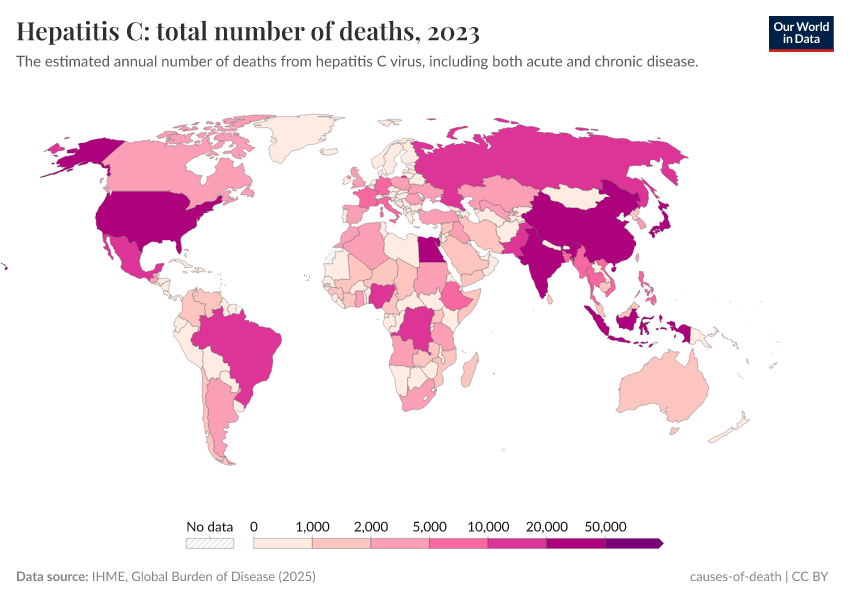 “Data Page: Hepatitis C: total number of deaths”, part of the following publication: Esteban Ortiz-Ospina and Max Roser (2016) - “Global Health”. Data adapted from IHME, Global Burden of Disease. Retrieved from https://remove-datapage-tags.owid.pages.dev/grapher/hepatitis-c-number-of-deaths [online resource]How to cite this data