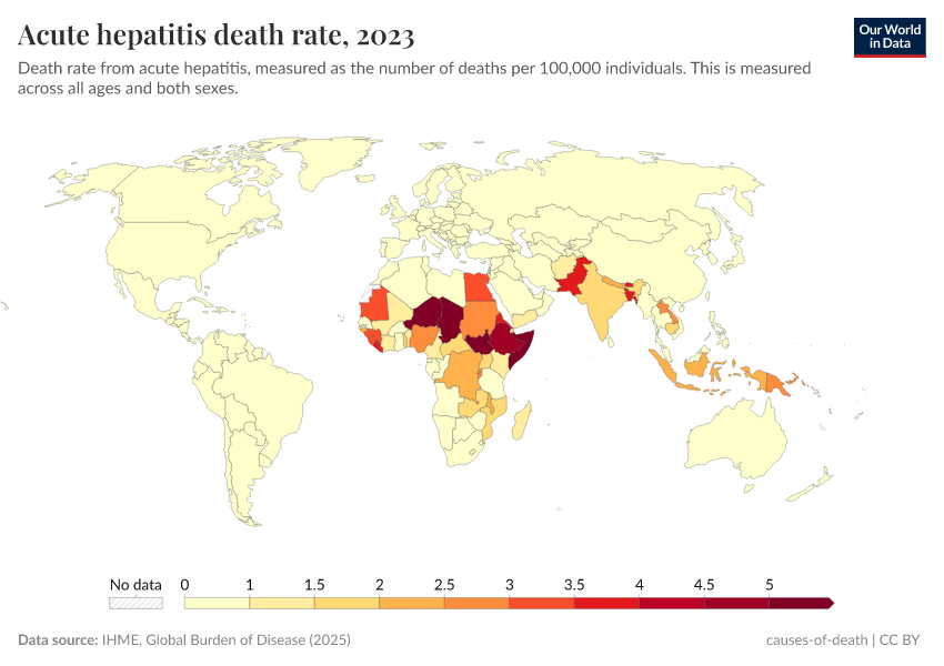 IHME, Global Burden of Disease (2024) – with minor processing by Our World in Data. “Acute hepatitis death rate” [dataset]. IHME, Global Burden of Disease, “Global Burden of Disease - Deaths and DALYs” [original data]. Retrieved June 26, 2025 from https://remove-datapage-tags.owid.pages.dev/grapher/hepatitis-death-rate