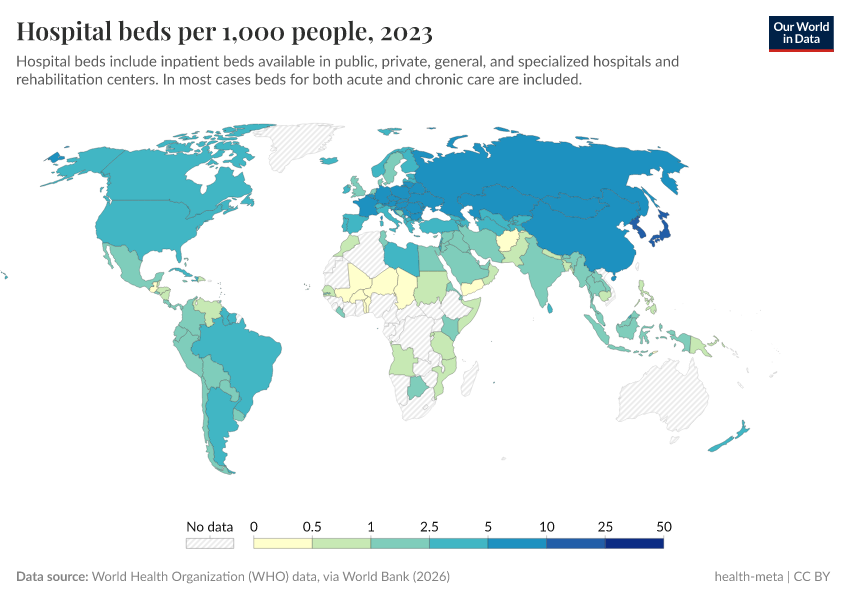 “Data Page: Hospital beds per 1,000 people”. Our World in Data (2025). Data adapted from World Health Organization, via World Bank. Retrieved from https://remove-datapage-tags.owid.pages.dev/grapher/hospital-beds-per-1000-people [online resource]How to cite this data