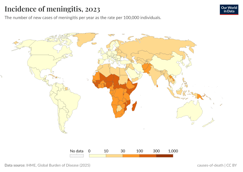 IHME, Global Burden of Disease (2024) – with major processing by Our World in Data. “Incidence of meningitis” [dataset]. IHME, Global Burden of Disease, “Global Burden of Disease - Prevalence and Incidence” [original data]. Retrieved June 26, 2025 from https://remove-datapage-tags.owid.pages.dev/grapher/incidence-of-meningitis