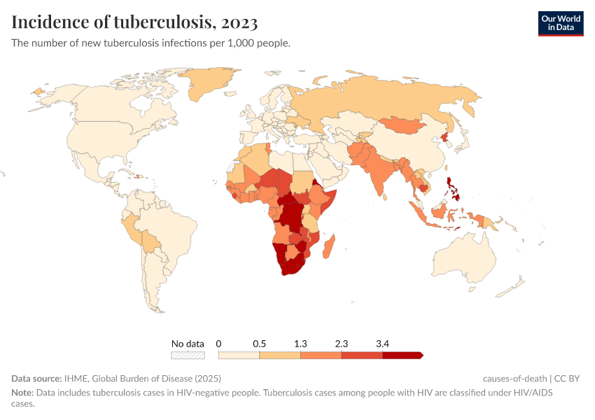 IHME, Global Burden of Disease (2024) – with major processing by Our World in Data. “Incidence of tuberculosis” [dataset]. IHME, Global Burden of Disease, “Global Burden of Disease - Prevalence and Incidence” [original data]. Retrieved June 26, 2025 from https://remove-datapage-tags.owid.pages.dev/grapher/incidence-of-tuberculosis
