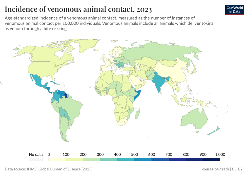 IHME, Global Burden of Disease (2024) – with major processing by Our World in Data. “Incidence of venomous animal contact” [dataset]. IHME, Global Burden of Disease, “Global Burden of Disease - Prevalence and Incidence” [original data]. Retrieved June 26, 2025 from https://remove-datapage-tags.owid.pages.dev/grapher/incidence-of-venomous-animal-contact