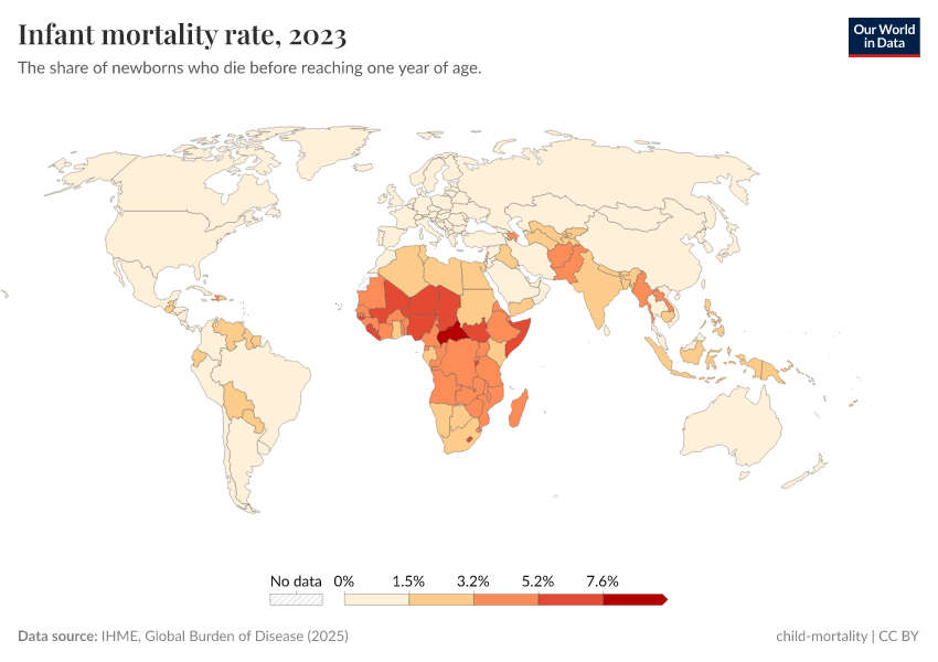 IHME, Global Burden of Disease (2024) – with minor processing by Our World in Data. “Infant mortality rate” [dataset]. IHME, Global Burden of Disease, “Global Burden of Disease - Child Mortality” [original data]. Retrieved June 26, 2025 from https://remove-datapage-tags.owid.pages.dev/grapher/infant-mortality-rate