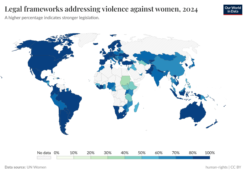 “Data Page: Legal frameworks addressing violence against women”. Our World in Data (2025). Data adapted from UN Women. Retrieved from https://remove-datapage-tags.owid.pages.dev/grapher/legal-frameworks-regarding-violence-against-women [online resource]How to cite this data