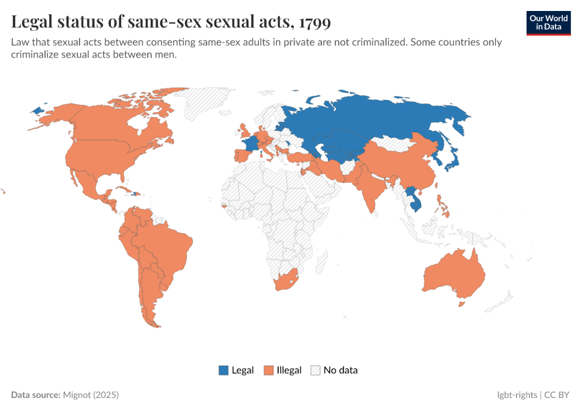 “Data Page: Legal status of homosexuality”, part of the following publication: Bastian Herre and Pablo Arriagada (2023) - “LGBT+ Rights”. Data adapted from Mignot. Retrieved from https://remove-datapage-tags.owid.pages.dev/grapher/legal-status-of-same-sex-sexual-acts [online resource]How to cite this data