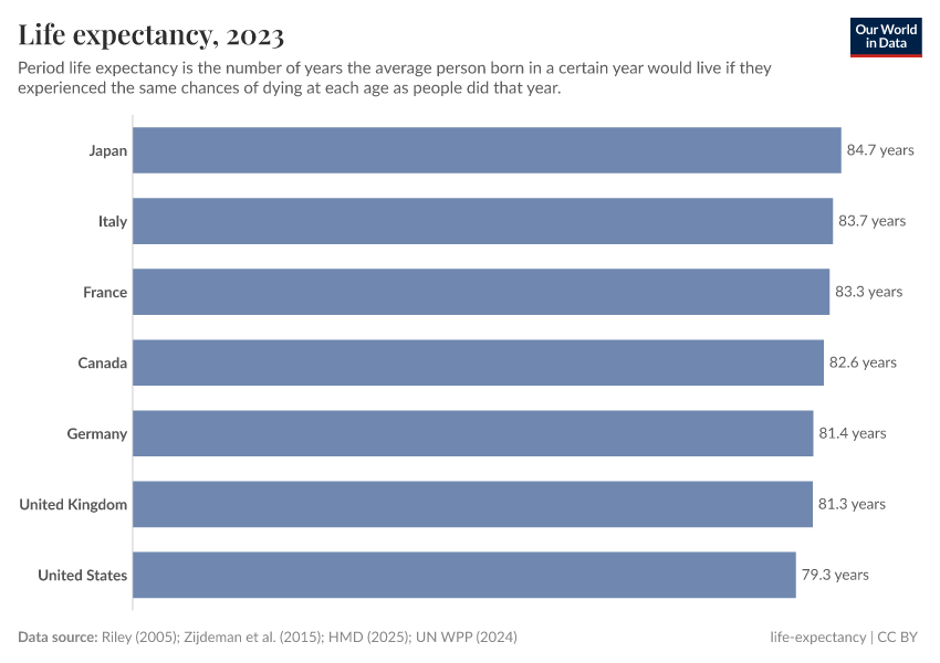 “Data Page: Life expectancy at birth”, part of the following publication: Saloni Dattani, Lucas Rodés-Guirao, Hannah Ritchie, Esteban Ortiz-Ospina, and Max Roser (2023) - “Life Expectancy”. Data adapted from Human Mortality Database, United Nations, Zijdeman et al., James C. Riley. Retrieved from https://remove-datapage-tags.owid.pages.dev:8789/20250626-164931/grapher/life-expectancy.html [online resource] (archived on June 26, 2025).