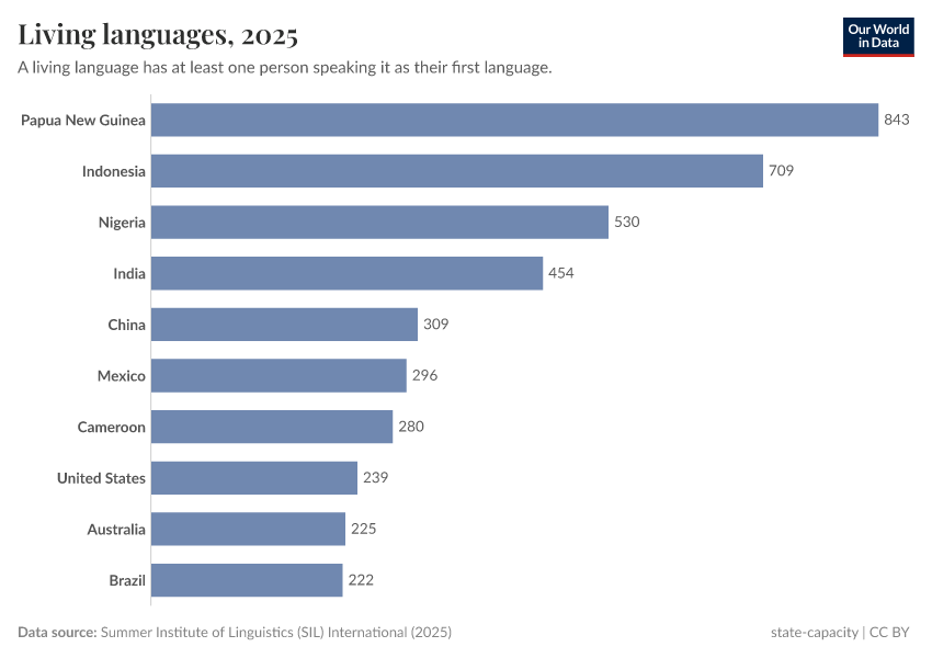 “Data Page: Living languages”, part of the following publication: Bastian Herre and Pablo Arriagada (2023) - “State Capacity”. Data adapted from Summer Institute of Linguistics (SIL) International. Retrieved from https://remove-datapage-tags.owid.pages.dev/grapher/living-languages [online resource]How to cite this data
