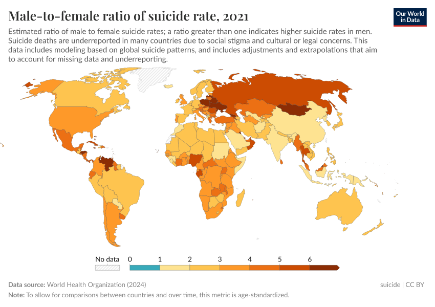World Health Organization (2024) – with major processing by Our World in Data. “Male-to-female ratio of suicide rate” [dataset]. World Health Organization, “Global Health Estimates” [original data]. Retrieved June 26, 2025 from https://remove-datapage-tags.owid.pages.dev/grapher/male-female-ratio-suicides-rates