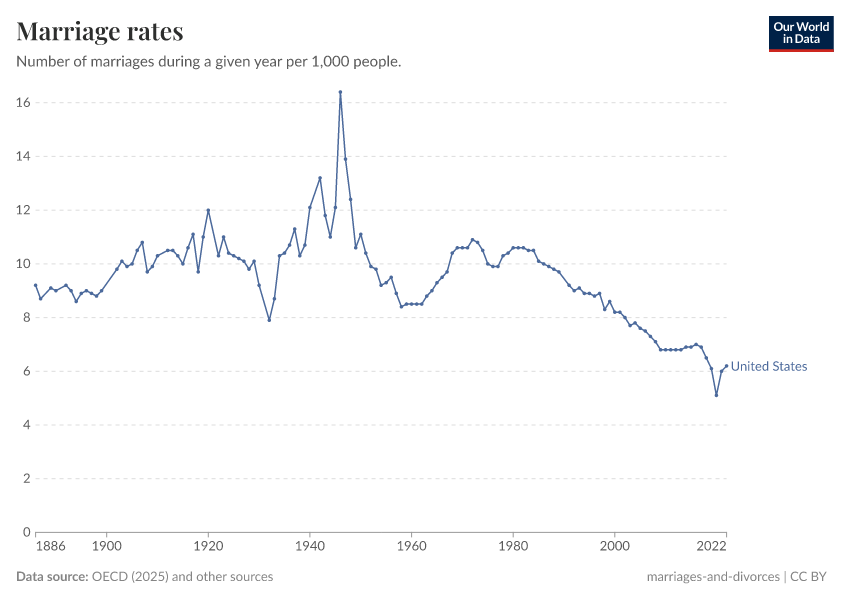 OECD (2024); US Census Bureau (1949); Centers for Disease Control and Prevention (2020) – processed by Our World in Data. “Marriage rates” [dataset]. OECD, “OECD Family Database”; US Census Bureau, “Vital Statistics, Health, and Nutrition Series”; Centers for Disease Control and Prevention, “Marriage Rates in the United States” [original data]. Retrieved June 26, 2025 from https://remove-datapage-tags.owid.pages.dev/grapher/marriage-rate-per-1000-inhabitants