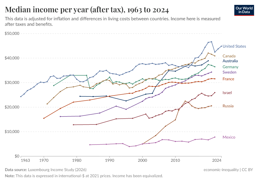 “Data Page: Median income (after tax)”, part of the following publication: Joe Hasell, Bertha Rohenkohl, Pablo Arriagada, Esteban Ortiz-Ospina, and Max Roser (2022) - “Poverty”. Data adapted from Luxembourg Income Study. Retrieved from https://remove-datapage-tags.owid.pages.dev/grapher/median-income-after-tax-lis [online resource]How to cite this data