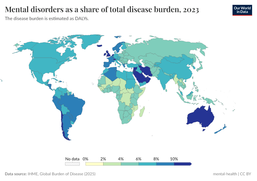 IHME, Global Burden of Disease (2024) – with minor processing by Our World in Data. “Mental disorders as a share of total disease burden” [dataset]. IHME, Global Burden of Disease, “Global Burden of Disease - Deaths and DALYs” [original data]. Retrieved June 26, 2025 from https://remove-datapage-tags.owid.pages.dev/grapher/mental-and-substance-use-as-share-of-disease