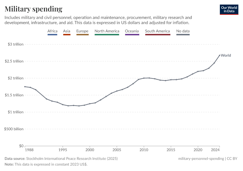 Stockholm International Peace Research Institute (2025) – with minor processing by Our World in Data. “Military spending” [dataset]. Stockholm International Peace Research Institute, “SIPRI Military Expenditure Database” [original data]. Retrieved June 26, 2025 from https://remove-datapage-tags.owid.pages.dev/grapher/military-spending-sipri