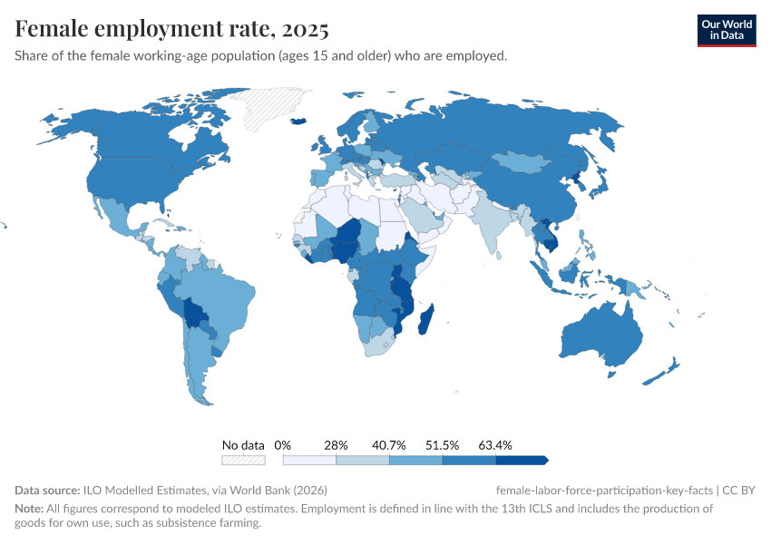 “Data Page: Female employment-to-population ratio”. Our World in Data (2025). Data adapted from International Labour Organization, ILOSTAT, via World Bank. Retrieved from https://remove-datapage-tags.owid.pages.dev/grapher/modeled-female-employment-to-population-ratio [online resource]How to cite this data