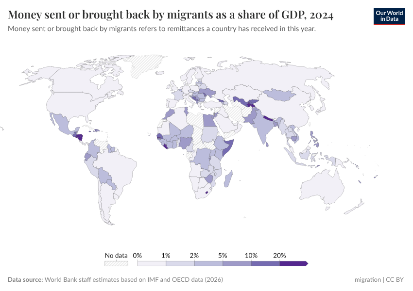 “Data Page: Money sent or brought back by migrants as a share of GDP”. Our World in Data (2025). Data adapted from World Bank based on IMF and OECD. Retrieved from https://remove-datapage-tags.owid.pages.dev/grapher/money-sent-or-brought-back-by-migrants-as-a-share-of-gdp [online resource]