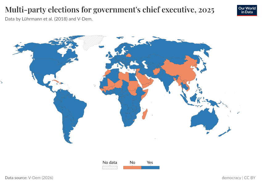 V-Dem (2025) – processed by Our World in Data. “Multi-party elections for government's chief executive – V-Dem” [dataset]. V-Dem, “Democracy report v15” [original data]. Retrieved June 26, 2025 from https://remove-datapage-tags.owid.pages.dev/grapher/multi-party-elections-hoe-row