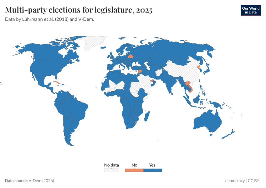 “Data Page: Multiparty elections for legislature”, part of the following publication: Bastian Herre, Lucas Rodés-Guirao, and Esteban Ortiz-Ospina (2013) - “Democracy”. Data adapted from V-Dem. Retrieved from https://remove-datapage-tags.owid.pages.dev/grapher/multi-party-elections-legislature-row [online resource]How to cite this data