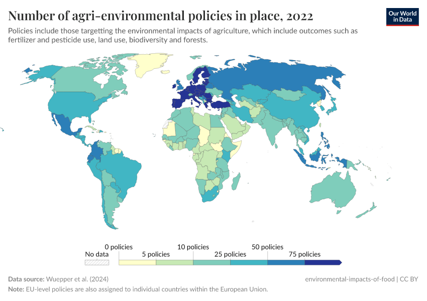 Wuepper et al. (2024) – processed by Our World in Data. “Number of agri-environmental policies in place” [dataset]. Wuepper et al. (2024), “agricultural_policies_wuepper” [original data]. Retrieved June 26, 2025 from https://remove-datapage-tags.owid.pages.dev/grapher/number-agri-environmental-policies